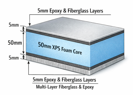The XPS boards are machined with a 5 axis CNC machine, then glued together, then laminated with fiberglass coatings: