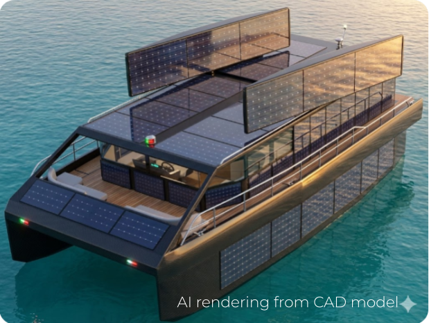 Semi-SWATH design with linear extruded hulls. Batteries, water tanks and other utilities are in the hull, the cabin is on the main platform.